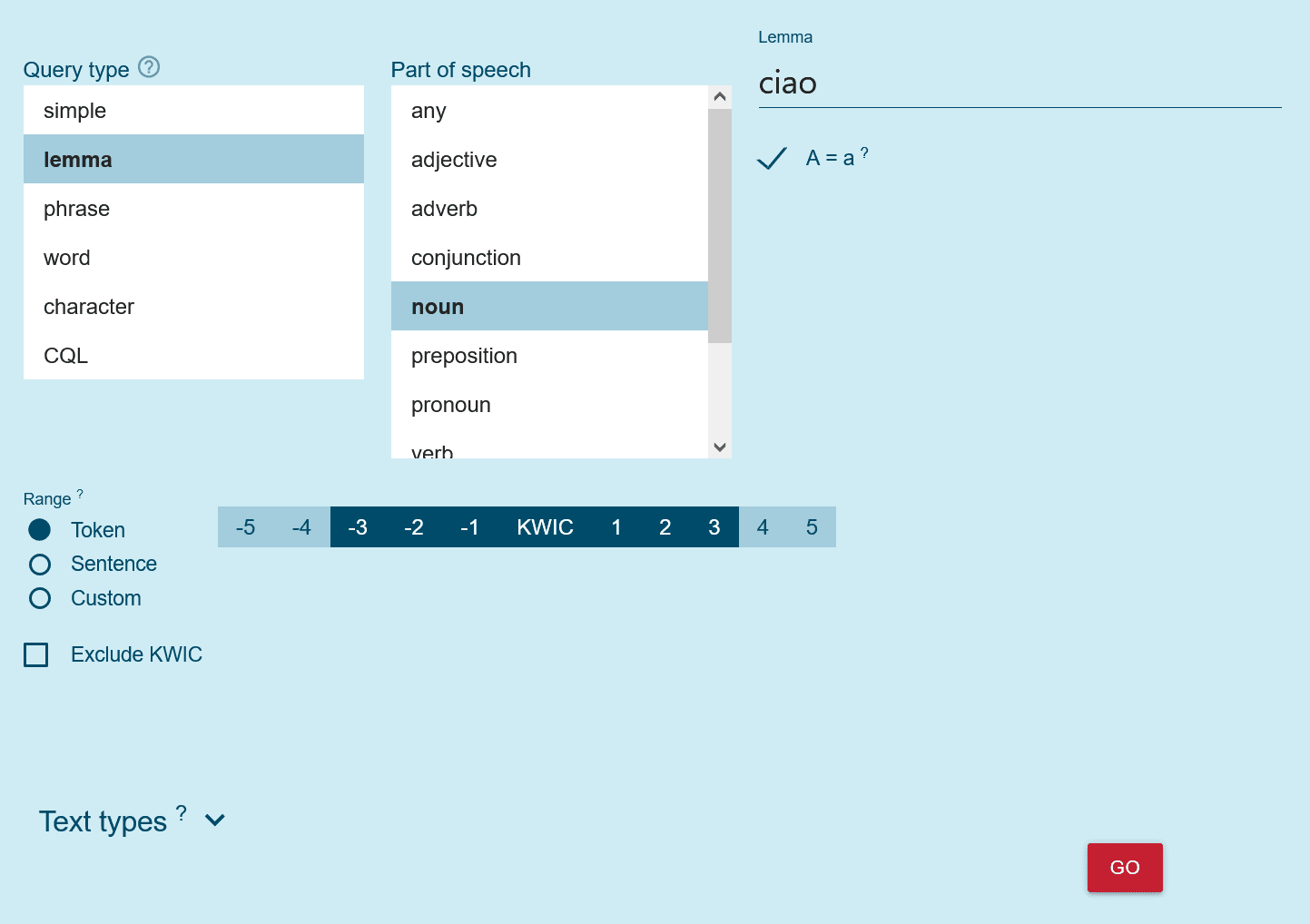 Einfache Token-Suche nach ‘ciao’ als Lemma.