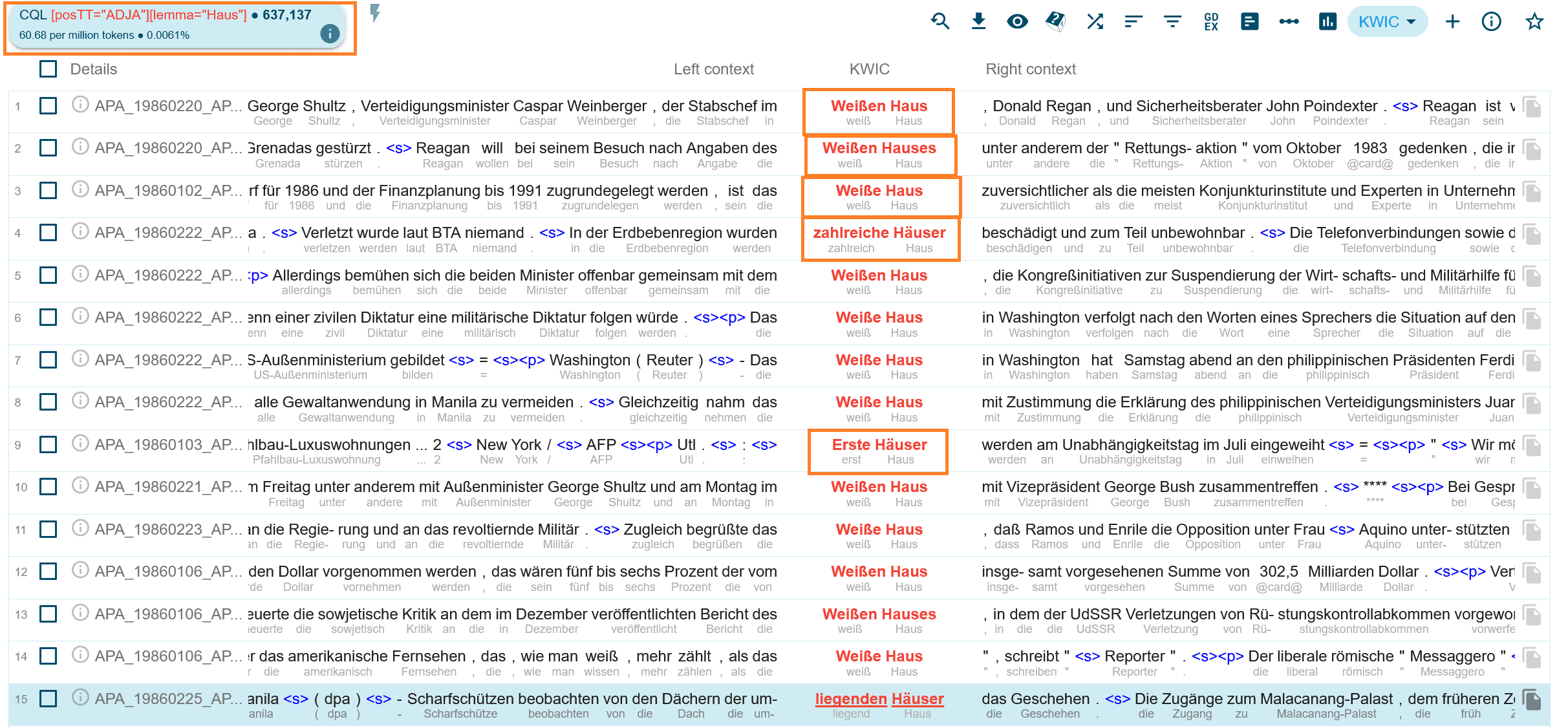 Da bei der simple search wie erwähnt auch nach den Wortformen eines Lemmas gesucht wird, findet eine Suchanfrage schön Haus auch alle Paarungen der Wortformen des Lemmas schön und der Wortformen des Lemmas Haus und das unabhängig von Groß- oder Kleinschreibung. Somit erscheinen im Ergebnis z.B. schönes Haus, schönsten Hauses, Schöneren Häusern etc.