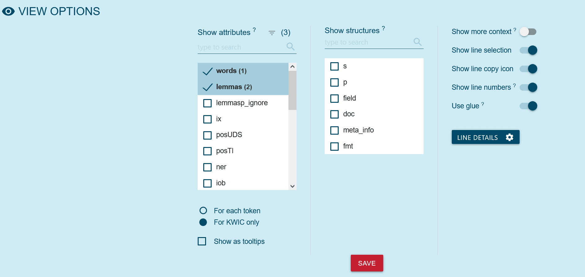Nach einer erfolgten Suche kann über Auswahl der View options (dem Auge-Symbol in der Werkzeugleiste) die Anzeige angepasst werden. Hilfreich ist, dass hier die Anzeige einzelner Attribute oder Strukturen ein- oder ausgeblendet werden kann. In View Options kann auch angegeben werden, ob die ausgewählten Attribute nur für den eigentlichen Treffer (meist die beste Wahl) oder für alle Wörter der KWIC-Liste angezeigt werden sollen. Weiters besteht die Option, die ausgewählten Attribute as tooltips, d.h. nur bei mouse over anzuzeigen.