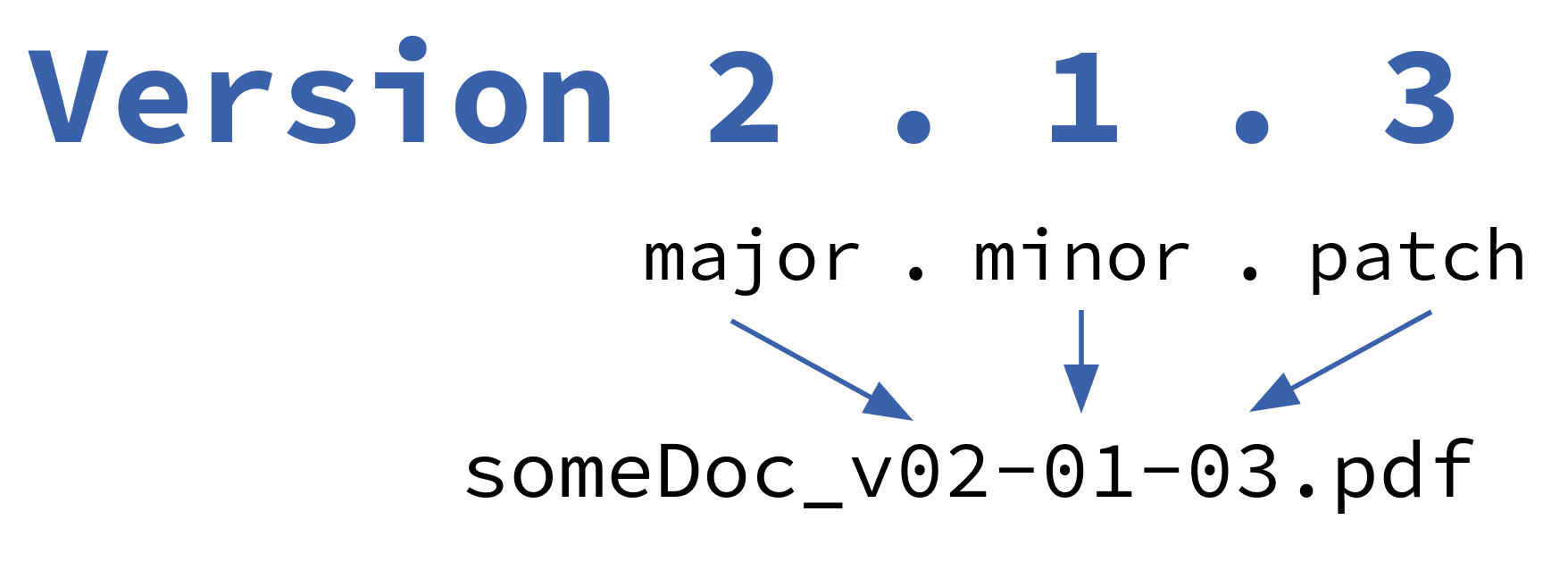 Was macht eine neue Version aus? Hier bietet sich die semantische Versionierung als Methode an, welche aus dem Bereich der Softwareprogrammierung kommt (siehe: semver). Es gibt eine Adaption für die Arbeit an Textdokumenten (siehe: semverdoc). Sie beschreibt, wie Versionsnummern und -benennung sinnvoll gewählt und angewendet werden: